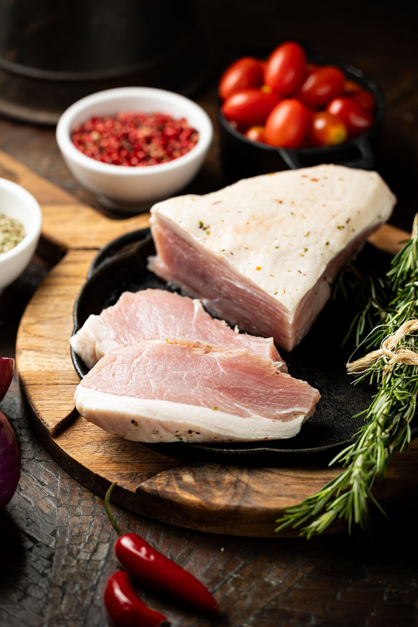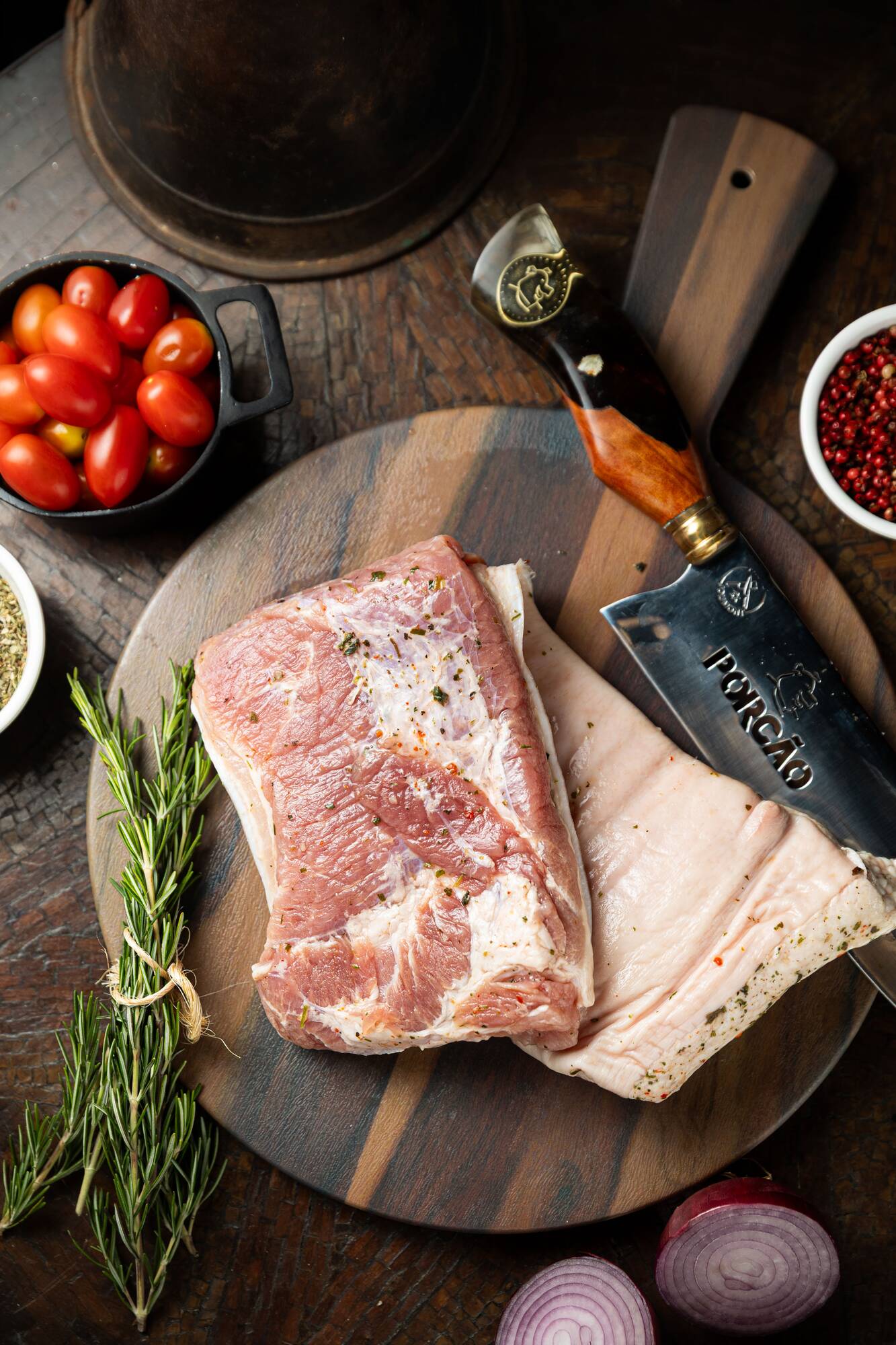 A Porchetta Suína Marinada é um corte tradicional e saboroso, preparado a partir da barriga de porco desossada e temperada com ervas e especiarias.